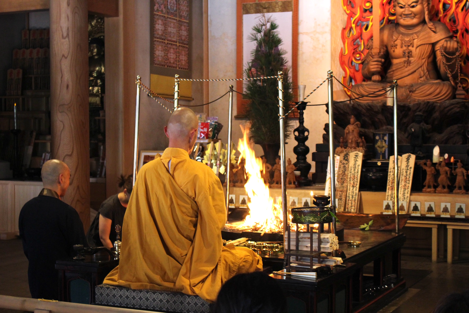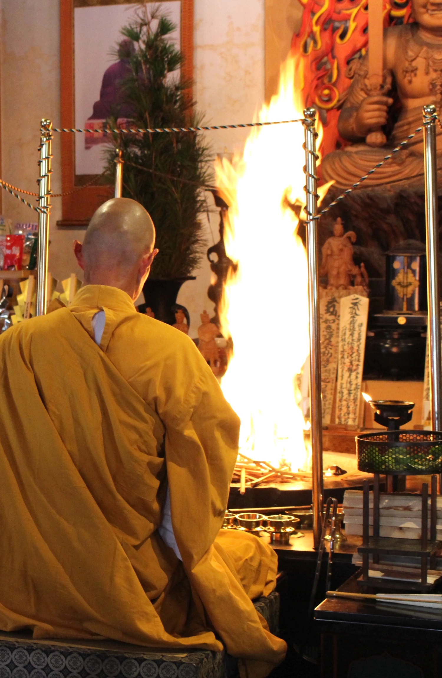*護摩祈祷:炎を燃やし、護摩木や米、お香などの供物を投入して煩悩を焼き尽くし、願い事を仏様に届ける